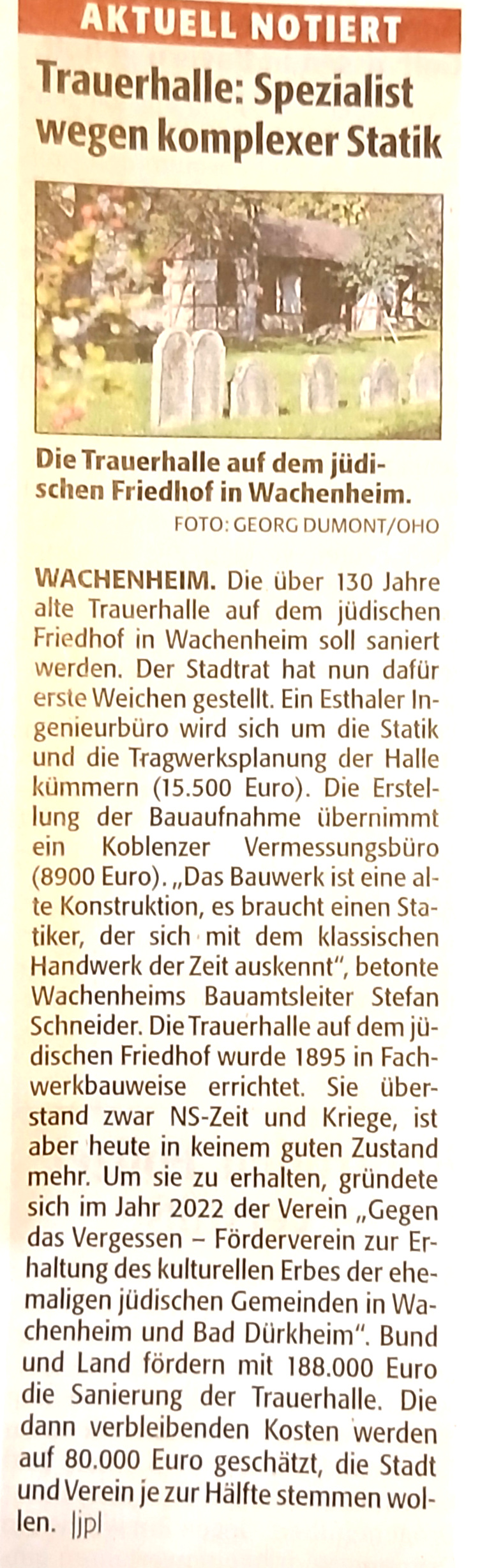 Der Friedhof ist im religiösen Leben der Juden ebenso bedeutsam wie die Synagoge und ein Ort der Gottesbegegnung. Die Bedeutung zeigt sich auch in den Namen, mit denen Friedhöfe bezeichnet werden: „Bejt olam“ - Haus der Ewigkeit oder „Bejt hachajim“ - Haus des Lebens. Dies deutet an, dass die Toten an diesem Platz in Ewigkeit ruhen dürfen. Den Toten darf dieser Ruheort nicht genommen werden, da sie auf die Auferweckung „am Ende der Tage“ und auf ein ewiges Leben von Leib und Seele warten. Jüdische Friedhöfe werden deshalb nicht neu belegt.Wem es bisher nicht möglich war, den jüdischen Friedhof in Wachenheim zu besuchen, kann sich einen ersten Eindruck mit unserer Bildergalerie verschaffen. Zu sehen ist ebenfalls die Trauerhalle aus dem Jahr 1895, die in ihrer Fachwerkbauweise einzigartig in Rheinland-Pfalz ist.Sollte die Galerie das Bedürfnis nach eigener Anschauung wecken: Gerne bieten wir Führungen mit fachkundiger Begleitung an.